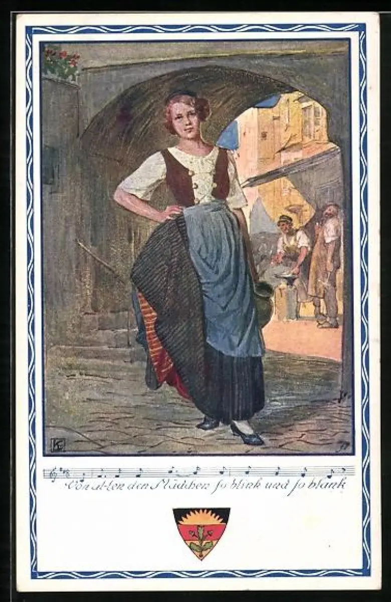 Künstler-AK Karl Friedrich Gsur, Deutscher Schulverein Nr. 372: Frau vor einem kleinen Bogen