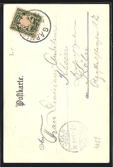 Personenbezogene Daten auf der Rückseite der Karte wurden durch blauen Textmarker unkenntlich gemacht. Die blauen Stellen sind auf die Vorderseite durchgeweicht und wirken sich negativ auf das Postkartenfoto aus