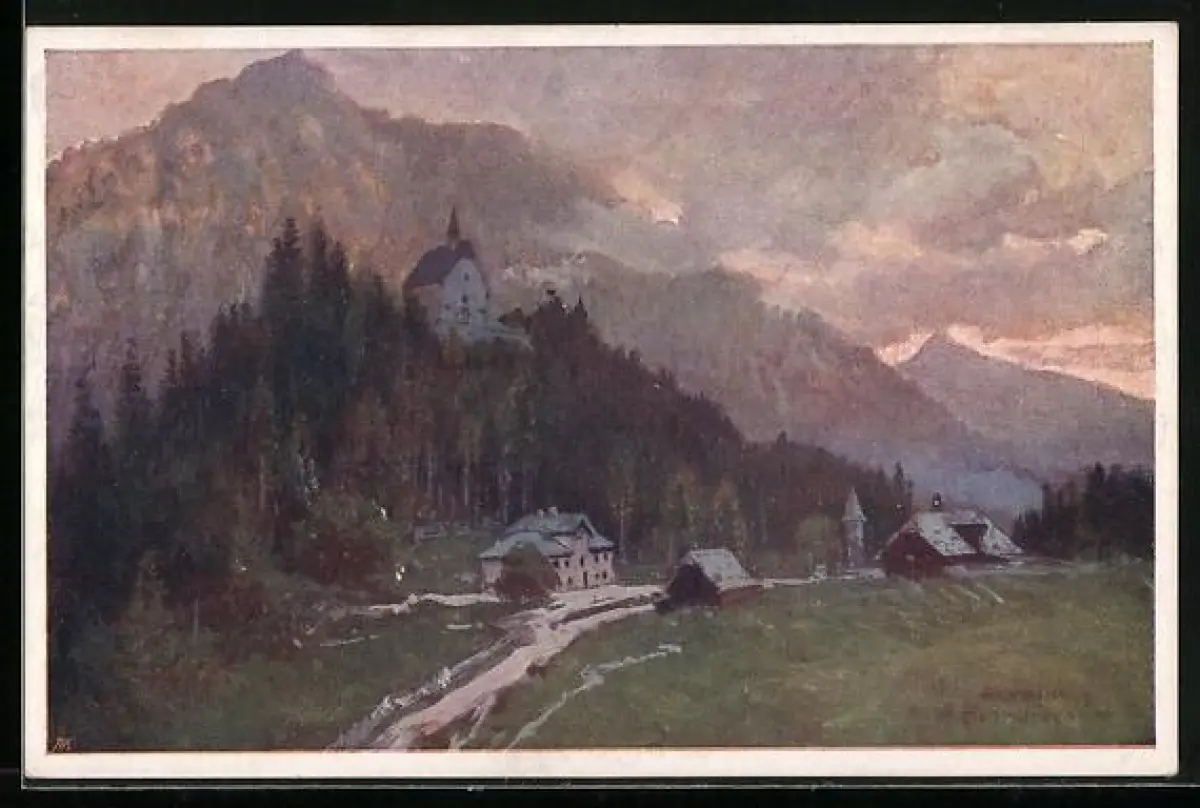 Künstler-AK Karl Ludwig Prinz: Mariazell-Ursprung, Sigmunds-Kapelle mit Strasse u. Bergpanorama