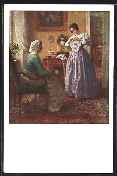 Künstler-AK Karl Maria Schuster: Das Neue Kleid, Frau in lilanem Kleid