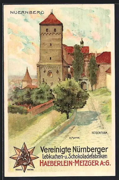 Künstler-AK Karl Mutter: Nürnberg, Heidenturm, Vereinigte Nürnberger Lebkuchenfabriken Haeberlein-Metzger AG