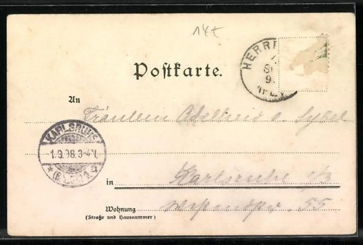 alte Ansichtskarte, gelaufen 1898, Briefmarke entfernt, Bugspur links unten, sonst guter Zustand