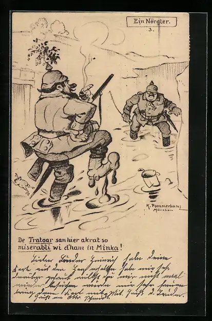 Künstler-AK Karl Pommerhanz: Ein Nörgler - De Tratoar san hier akrat so miserabli wi d`ham in Minka !