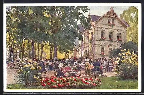 Künstler-AK Karlsbad, Gasthaus Freundschaftssaal mit Gartenlokal