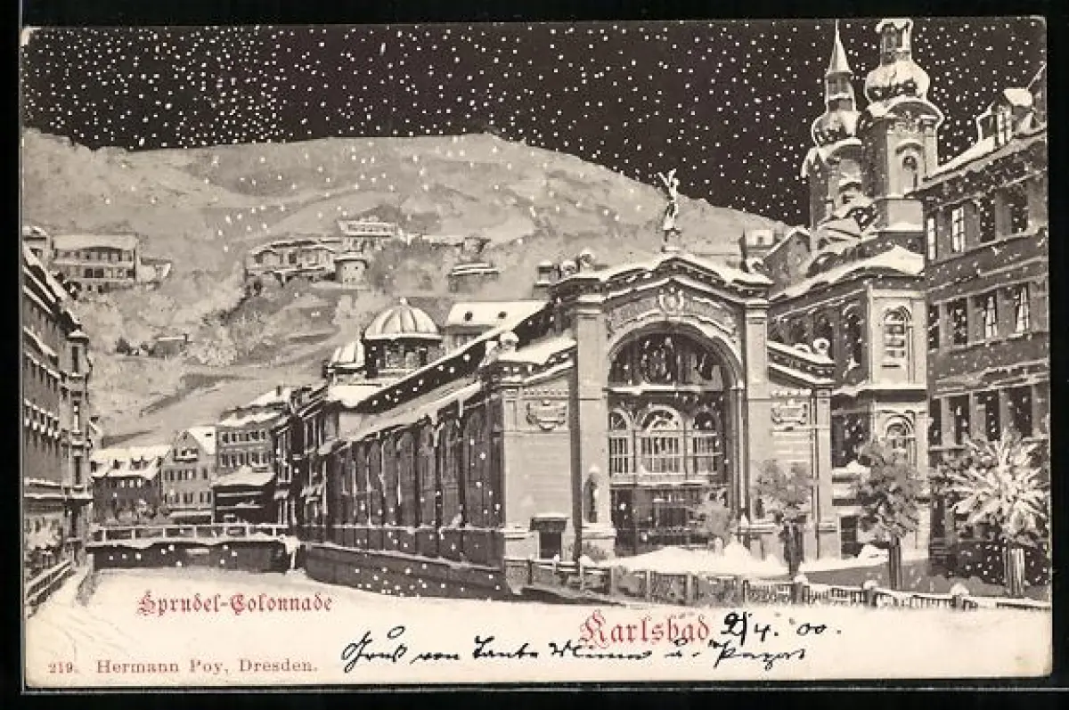 Künstler-AK Karlsbad, Sprudel-Colonnade im Schnee