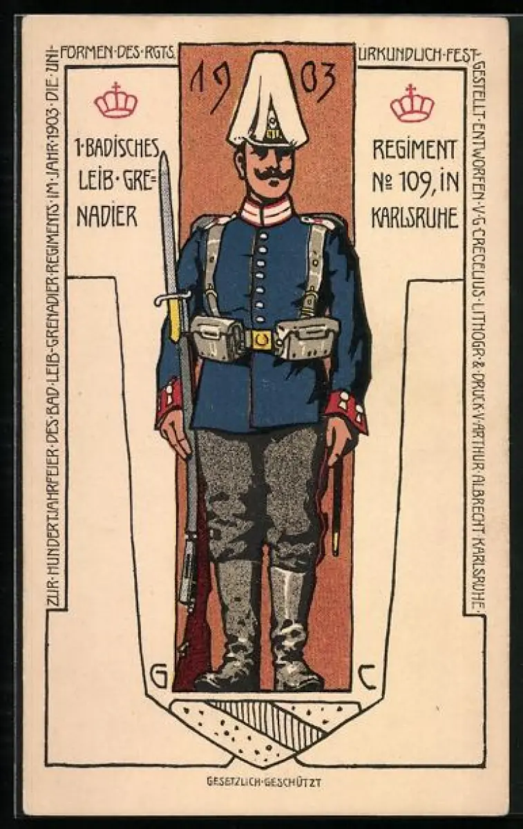 Künstler-AK Karlsruhe, 1. Badisches Leib-Grenadier Regiment No. 109, Uniform von 1903