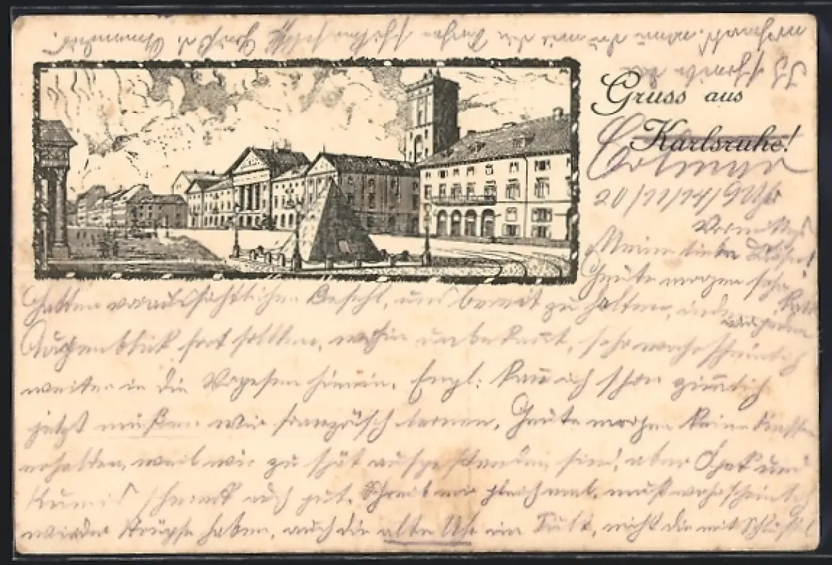 Künstler-AK Karlsruhe, Strassenpartie mit Pyramide