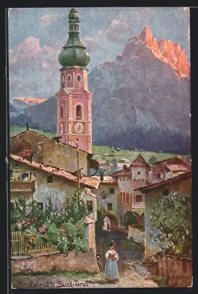 Künstler-AK Kastelruth, Strassenszene mit Frau in Tracht