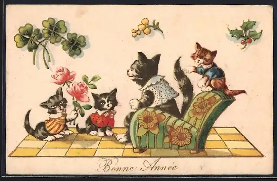 Künstler-AK Katzenmutter bekommt von ihren Kindern Rosen