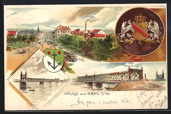 Künstler-AK Kehl a /Rh., Strassenpartie mit Gebäudeansicht und Strassenbahn, Brücke, Wappen