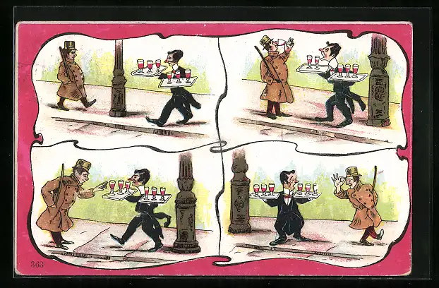 Künstler-AK Kellner serviert Weingläser auf zwei Tabletts, Mann trinkt heimlich davon, Serie in 4 Bildern