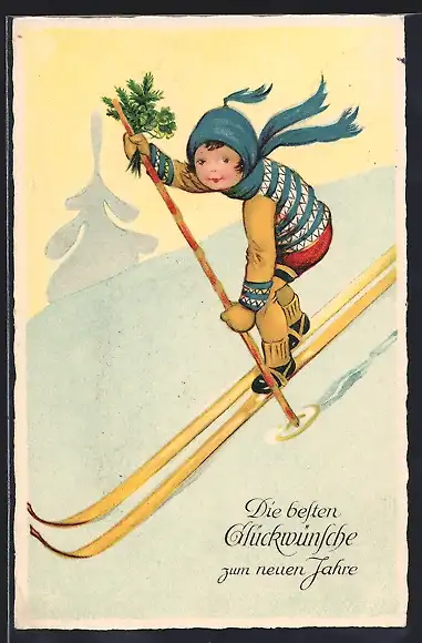 Künstler-AK Kind auf Skiern mit vierblättrigen Kleeblättern, Neujahrsgrüsse
