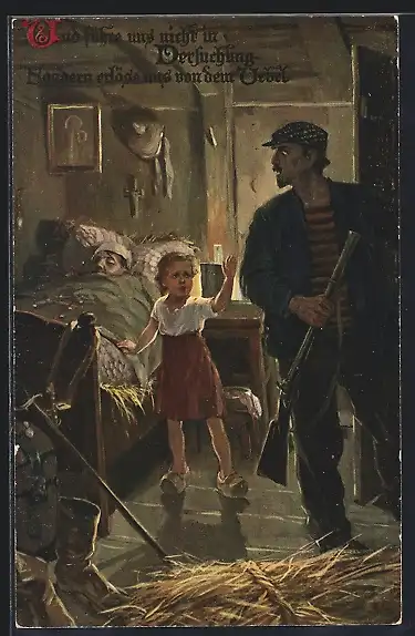 Künstler-AK Kind bei verwundetem Soldaten am Bett, Vaterunser
