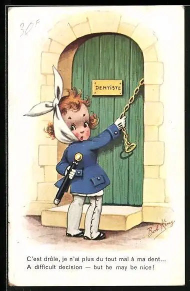 Künstler-AK Kind klingelt an der Tür eines Zahnarztes, A difficult decision- but he may be nice