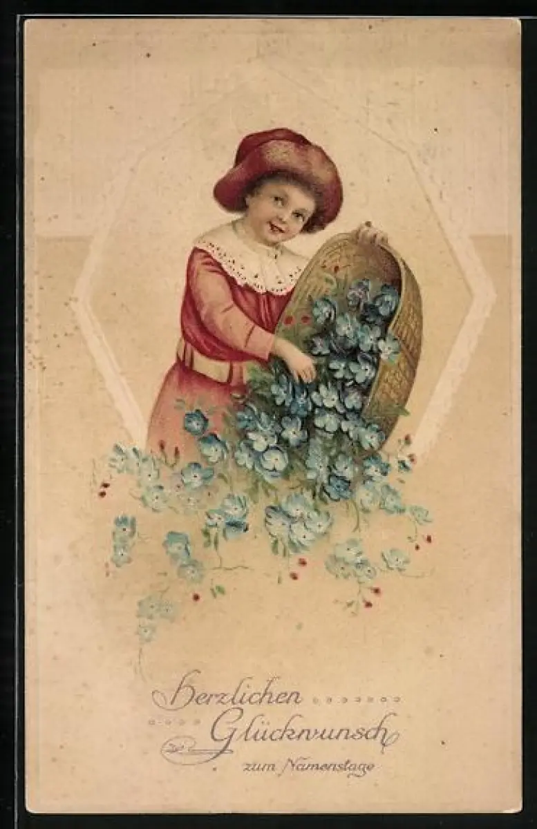 Künstler-AK Kind mit Korb voller Vergissmeinnicht zum Namenstag