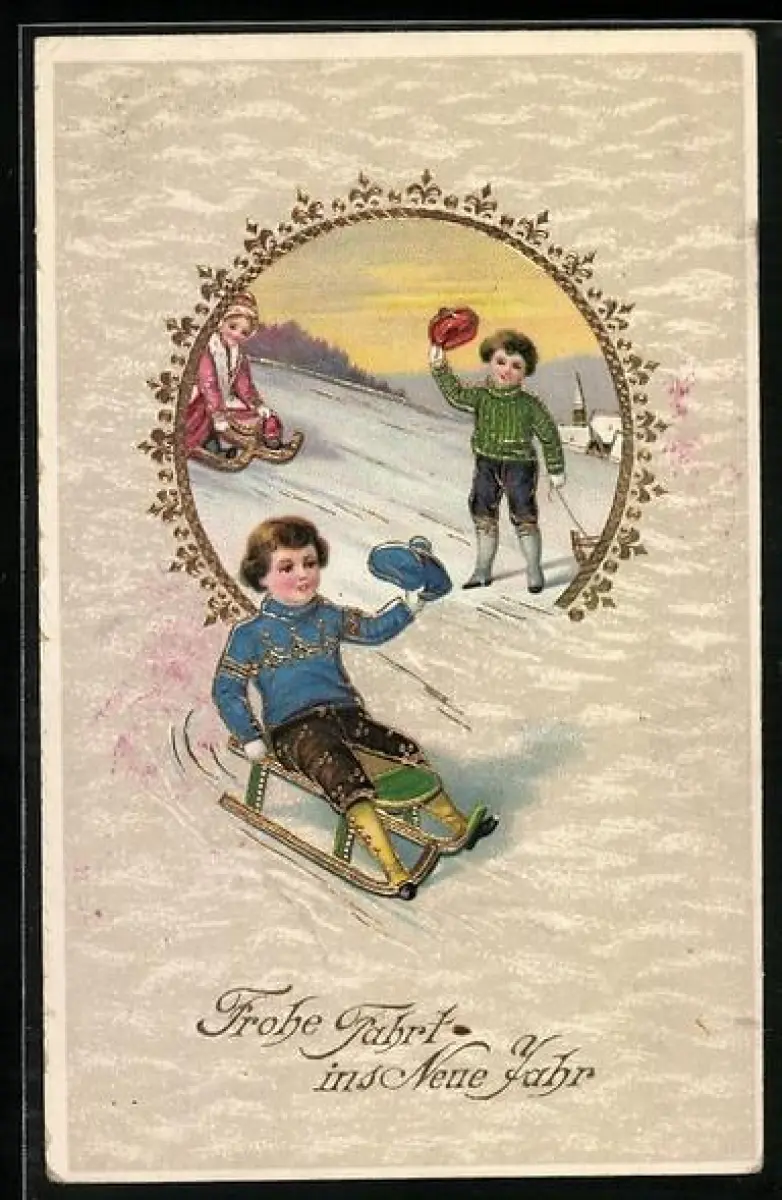 Künstler-AK Kinder beim Schlitten-Fahren, Frohe Fahrt ins Neue Jahr
