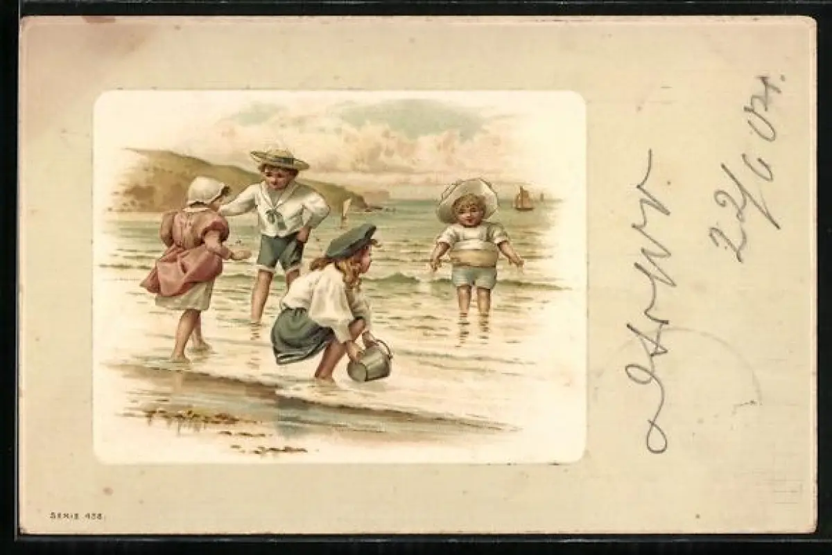 Künstler-AK Kinder in Badekleidung spielen am Strand in flachem Wasser