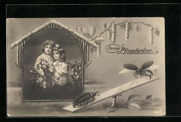 Künstler-AK Kinder in einem Häuschen, Maikäfer auf einer Wippe, Pfingstgruss