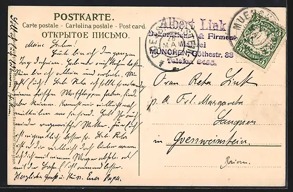 Personenbezogene Daten auf der Rückseite der Karte wurden durch blauen Textmarker unkenntlich gemacht. Die blauen Stellen sind auf die Vorderseite durchgeweicht und wirken sich negativ auf das Postkartenfoto aus