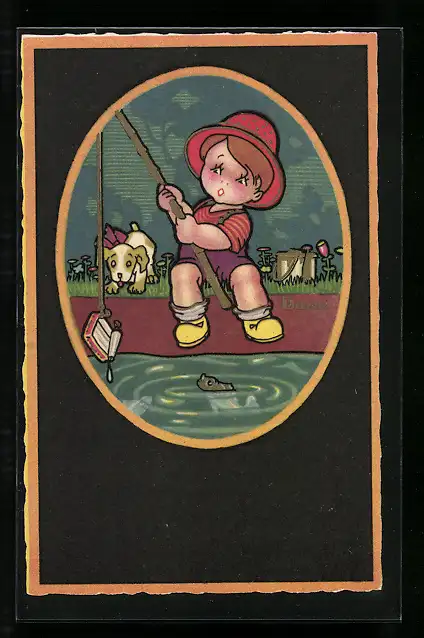 Künstler-AK Kleiner Angler mit leerer Konservendose als Fang