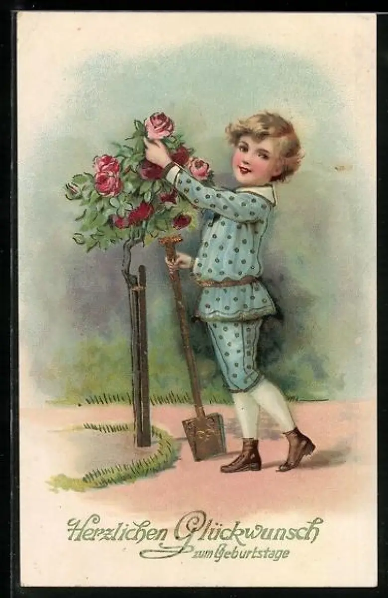 Künstler-AK Kleiner Gärtner bei einem Rosenstrauch