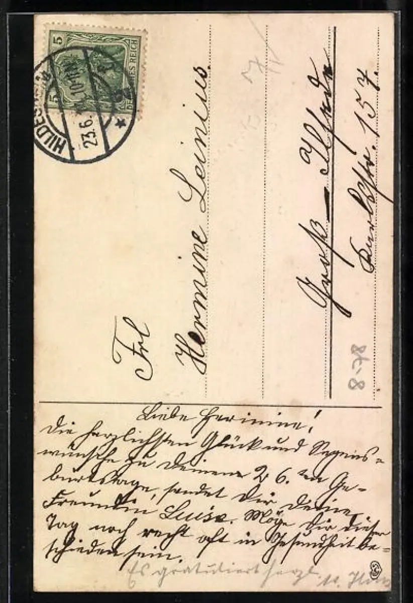 Personenbezogene Daten auf der Rückseite der Karte wurden durch blauen Textmarker unkenntlich gemacht. Die blauen Stellen sind auf die Vorderseite durchgeweicht und wirken sich negativ auf das Postkartenfoto aus