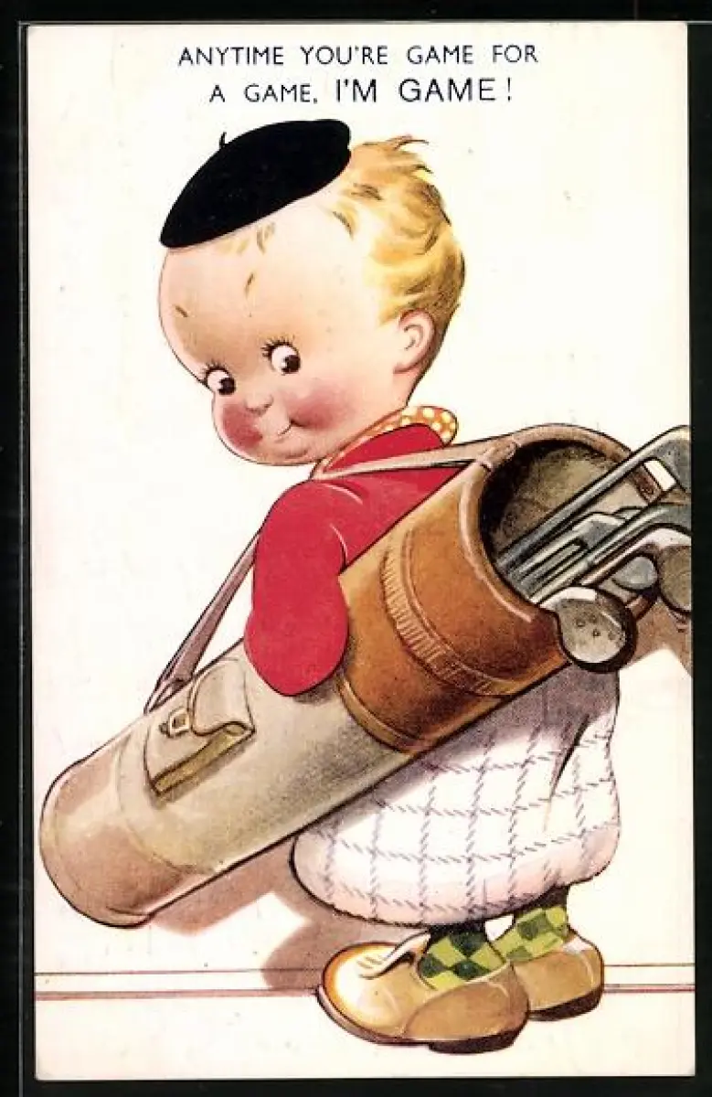 Künstler-AK Kleiner Junge mit Golfschlägern schaut über seine Schulter, Anytime you`re game for a game, I`m game