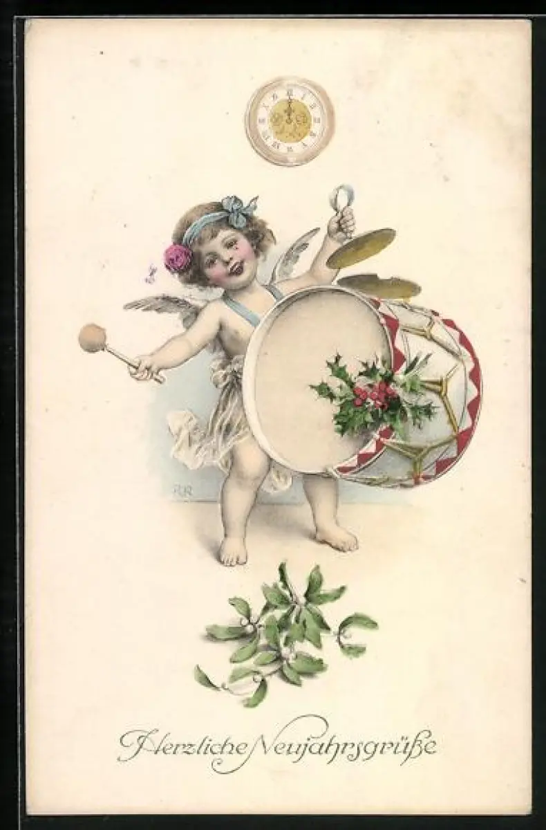 Künstler-AK Kleiner Neujahrsengel spielt eine Trommel