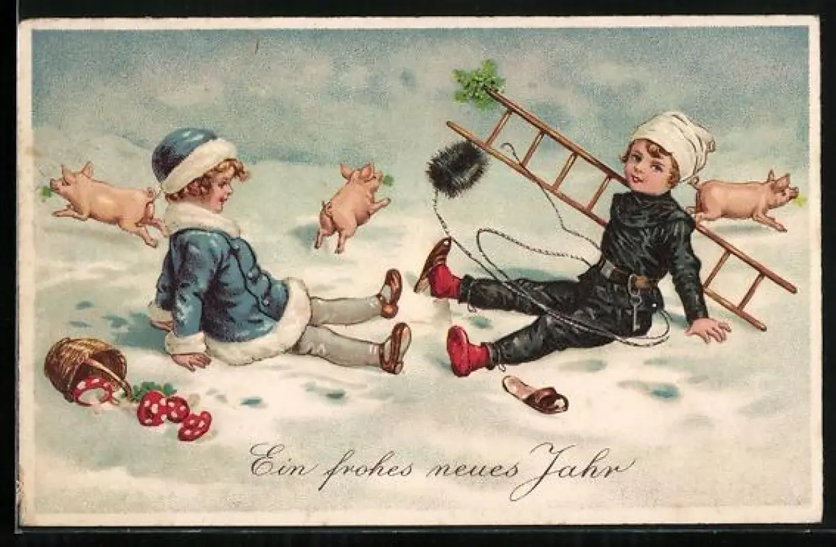 Künstler-AK Kleiner Schornsteinfeger und Kind sind im Schnee zusammengestossen