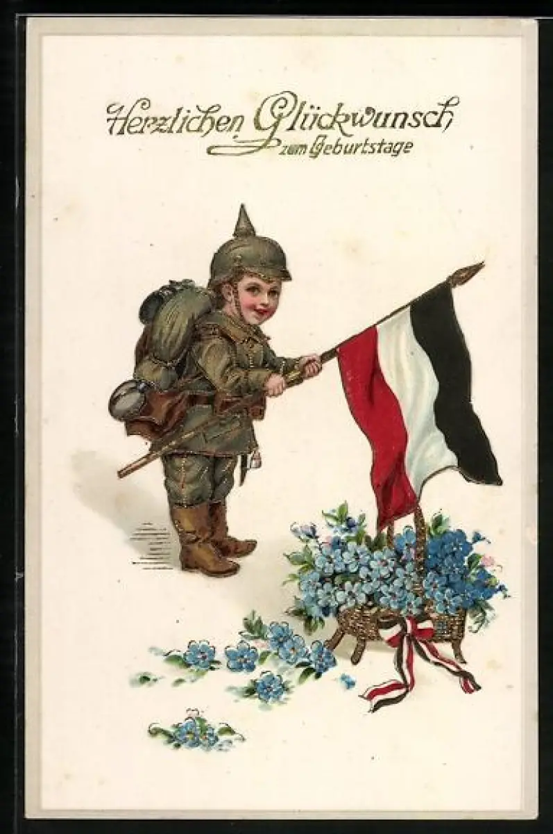 Künstler-AK Kleiner Soldat mit Reichsflagge und Vergissmeinnicht