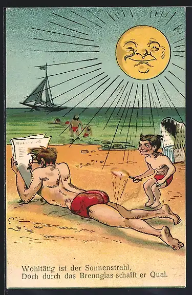 Künstler-AK Knabe verbrennt das Bein seines Vaters mit einem Brennglas