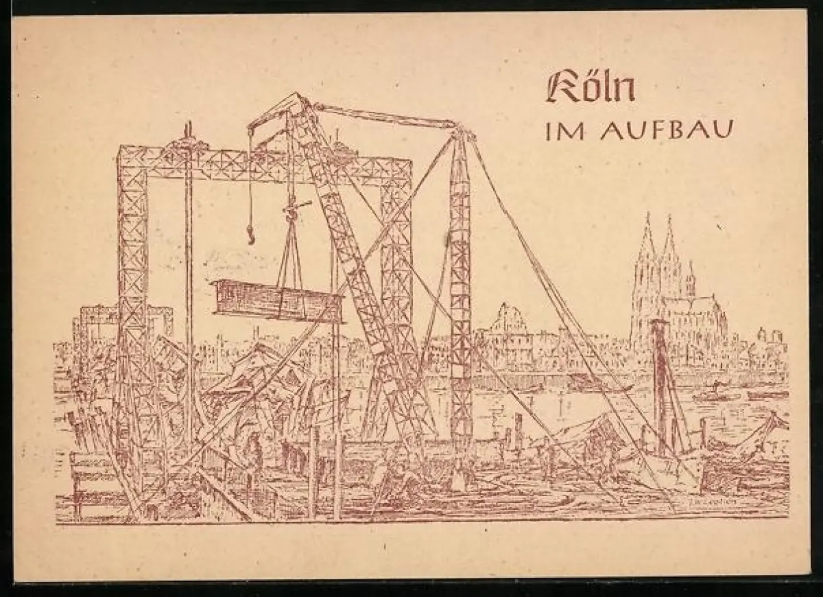 Künstler-AK Köln, Kräne bei Aufbauarbeiten in der Stadt