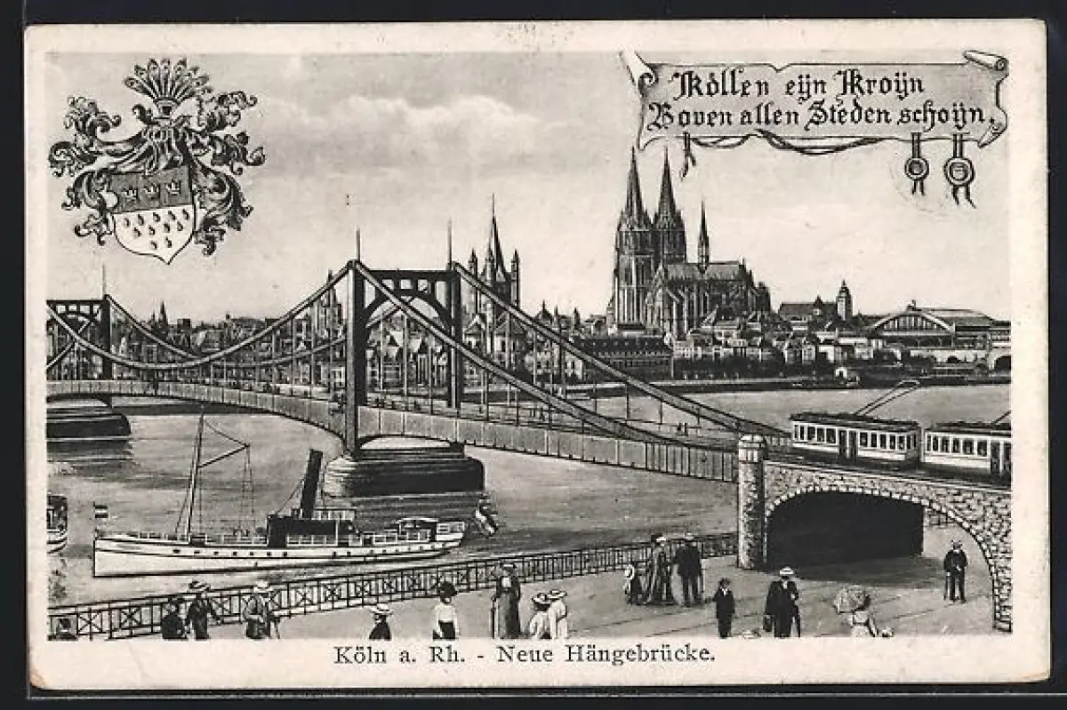 Künstler-AK Köln a. Rh., Strassenbahn auf der Neuen Hängebrücke