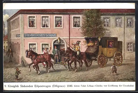 Künstler-AK Königlich Sächsischer Eilpostwagen 1846, letzte Fahrt Löbau-Görlitz vor Eröffnung der Eisenbahn, Postkutsche