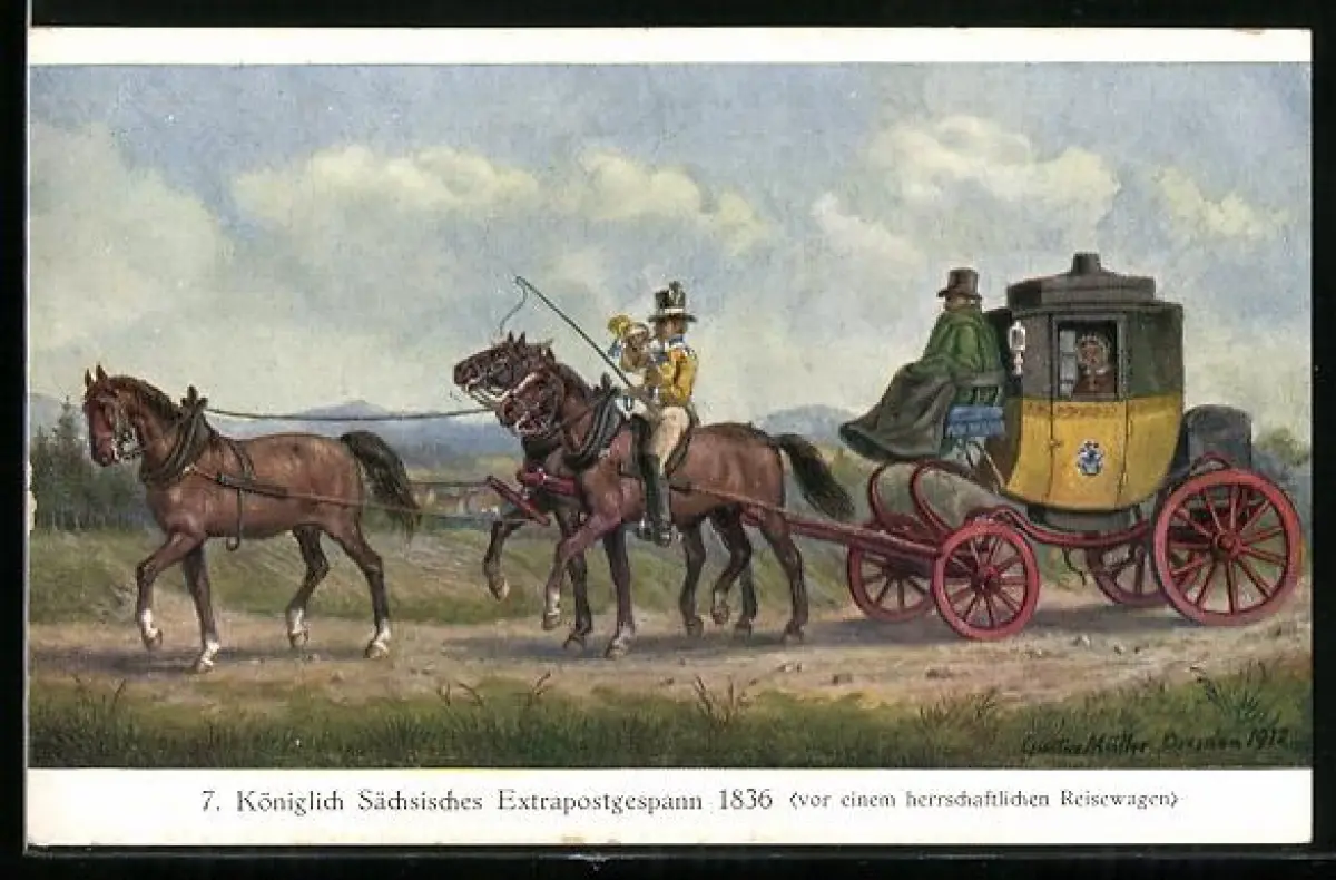 Künstler-AK Königlich Sächsisches Extrapostgespann 1836 vor einem herrschaftlichen Reisewagen, Postkutsche