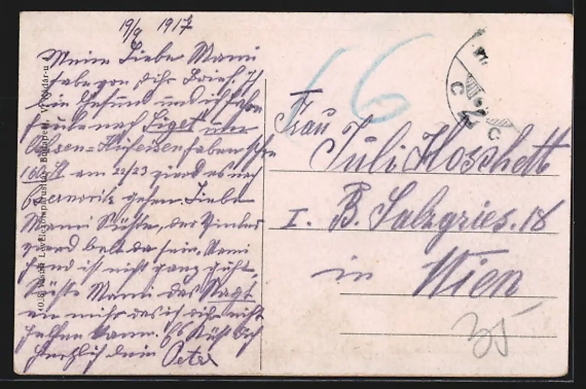 gelaufen 1917, Briefmarke entfernt, leicht fleckig, guter Zustand