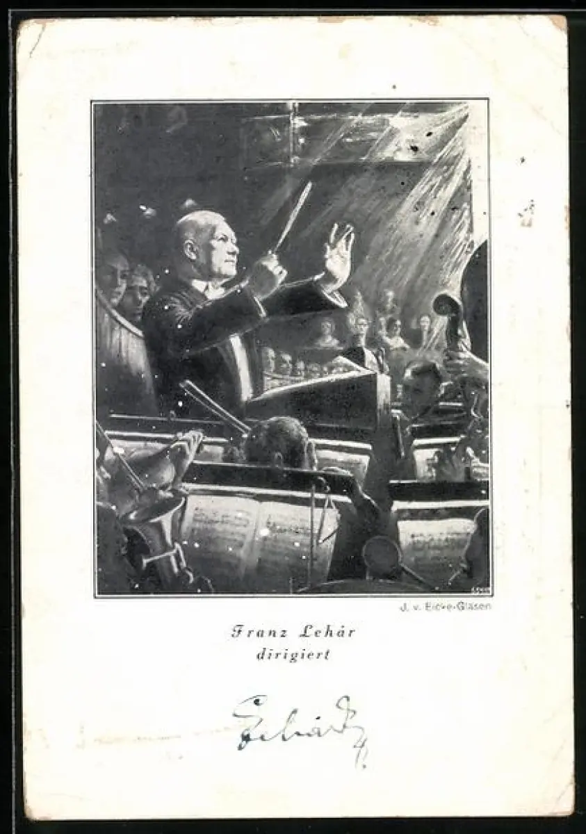 Künstler-AK Komponist Franz Lehár dirigiert, Vorderseitig Autograph