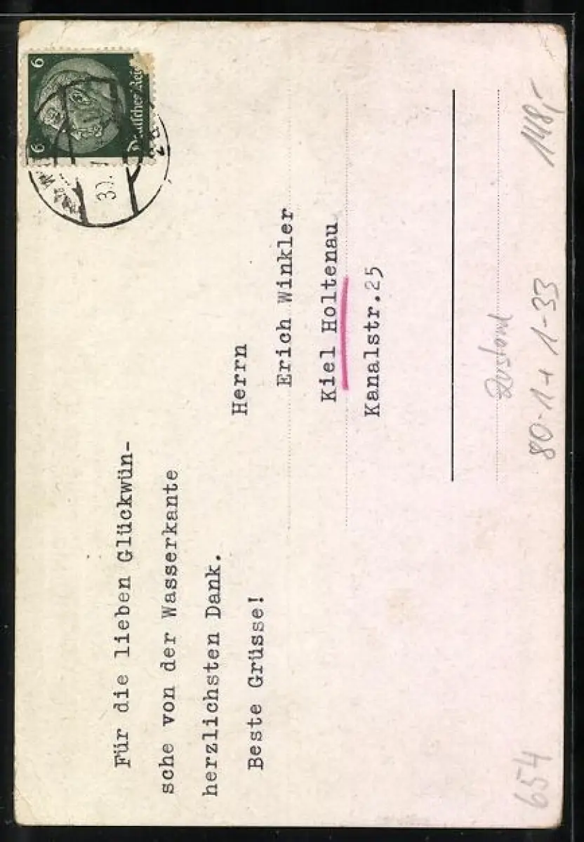 alte Ansichtskarte, gelaufen, Eckknicke oben und unten, Stempelspur