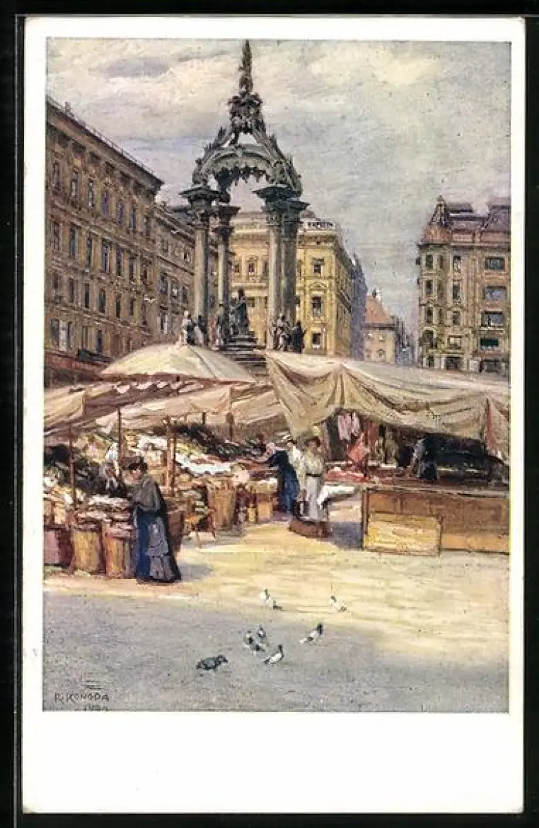 Künstler-AK Konopa: Wien I, Hoher Markt, Menschen beim Einkaufen