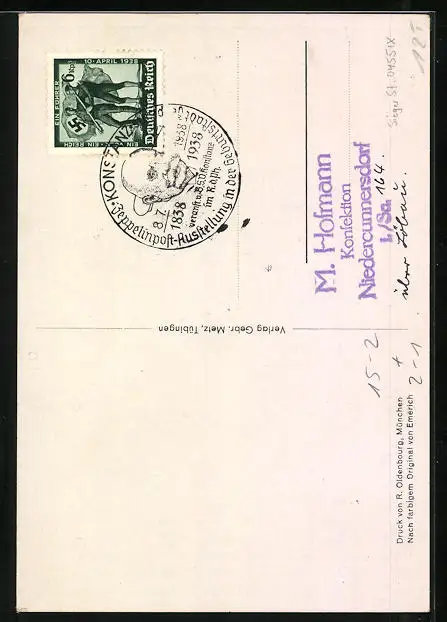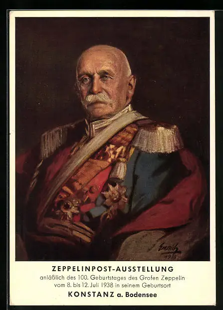 Künstler-AK Konstanz a. Bodensee, Zeppelinpost-Ausstellung z. 100. Geburtstages des Grafen Zeppelin vom 8.-12. Juli 1938
