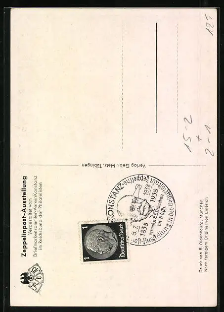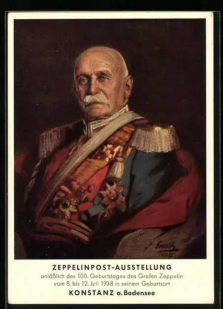 Künstler-AK Konstanz a. Bodensee, Zeppelinpost-Ausstellung z. 100. Geburtstages des Grafen Zeppelin vom 8.-12. Juli 1938