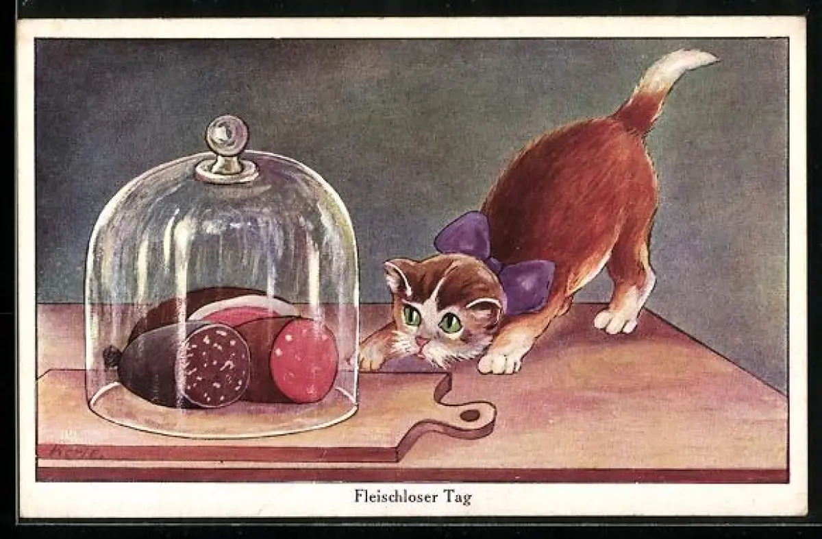 Künstler-AK Korle: Fleischloser Tag, Kätzchen sehnt sich nach Wurst
