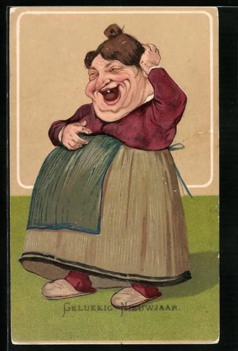 Künstler-AK Kräftige Frau lacht, frauenfeindlicher Humor