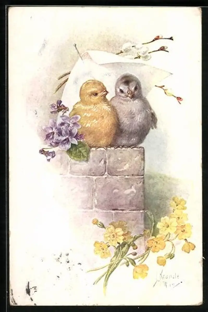 Künstler-AK Kränzle: Herzliche Ostergrüsse, Kükenpaar unter einem Zettel sitzend