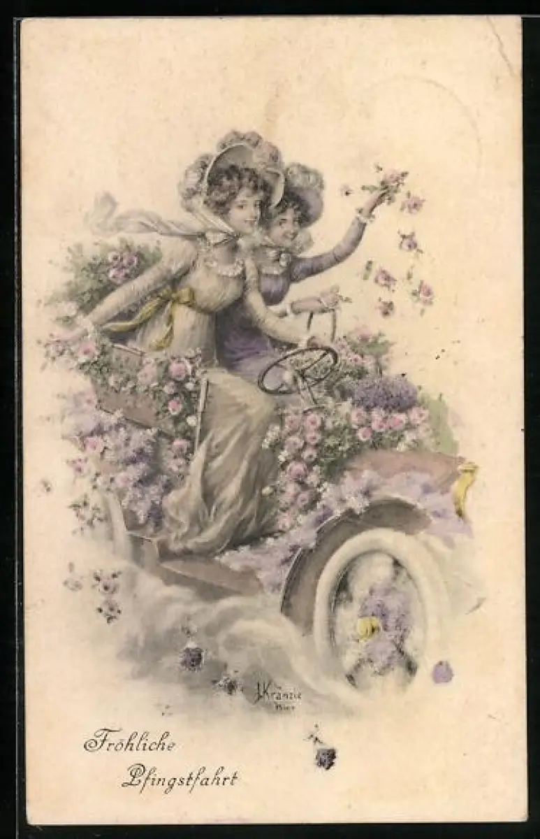 Künstler-AK Kränzle: Zwei Damen in einem blumengeschmückten Auto