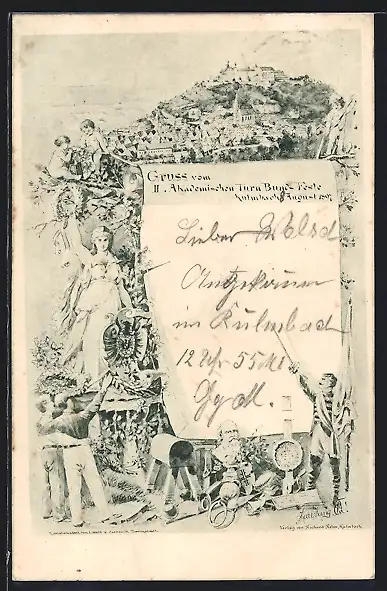 Künstler-AK Kulmbach, II. Akademisches Turn Bund-Feste 1897, Teilansicht, Frau mit Kranz, Turnvater Jahn