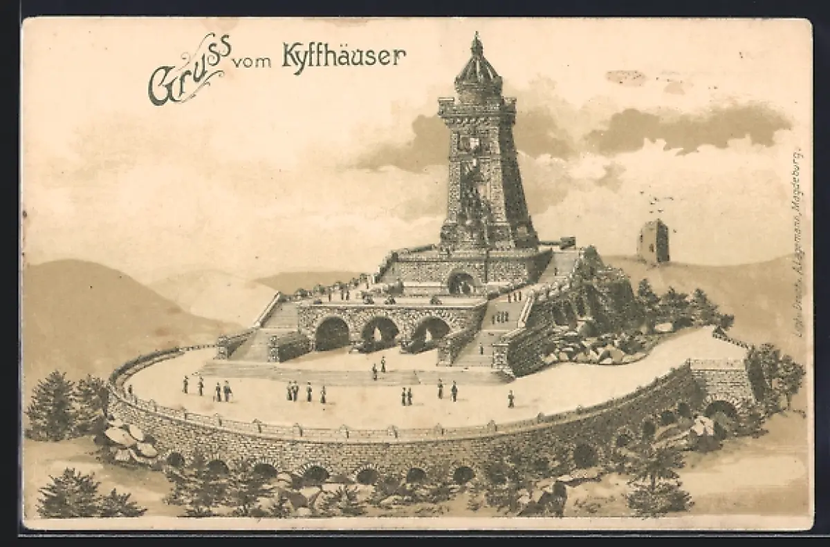 Künstler-AK Kyffhäuser, Kaiser Wilhelm-Denkmal aus der Vogelschau