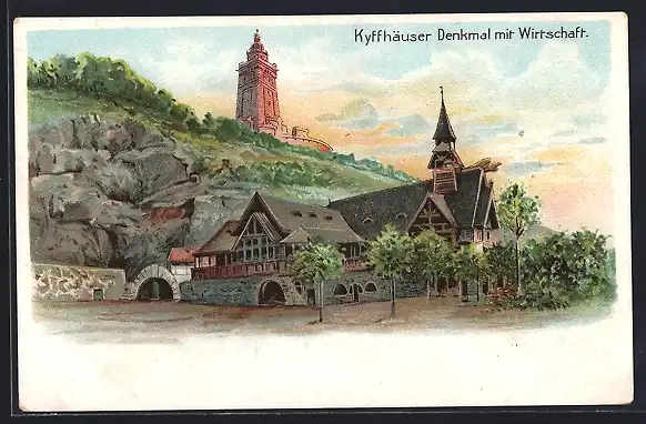 Künstler-AK Kyffhäuser, Kyffhäuser Denkmal mit Gasthaus
