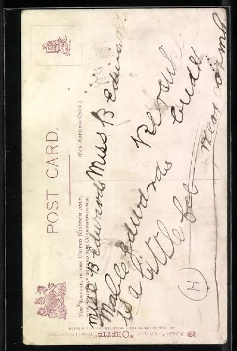 Personenbezogene Daten auf der Rückseite der Karte wurden durch blauen Textmarker unkenntlich gemacht. Die blauen Stellen sind auf die Vorderseite durchgeweicht und wirken sich negativ auf das Postkartenfoto aus