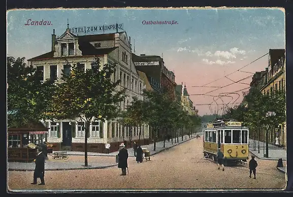 Künstler-AK Landau, Ostbahnstrasse und Strassenbahn